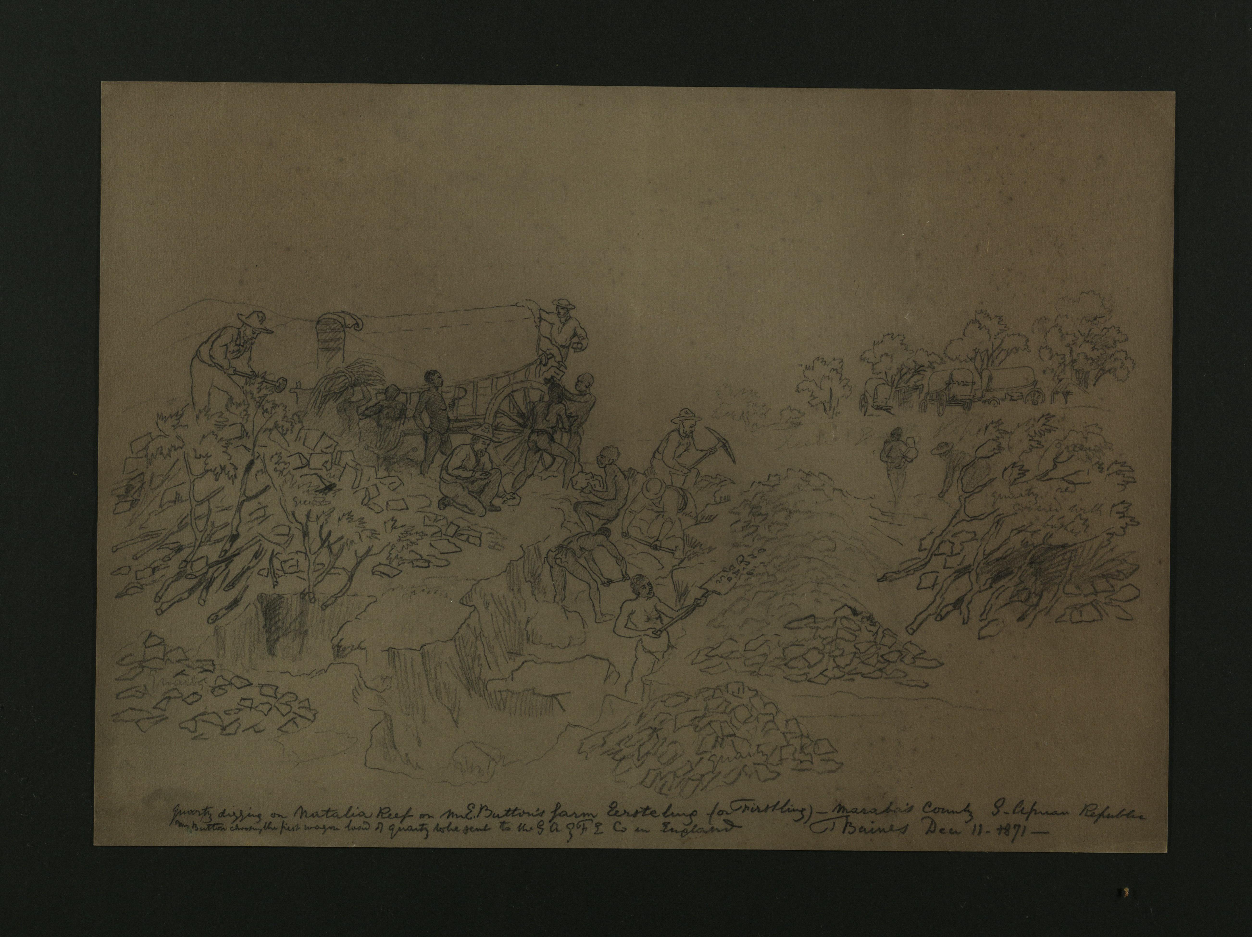 Pencil inscription on sketch: "Quartz digging on Natalia reef on Mr E. Button's farm Eersteling (or Firstling) - Maraba's Country S-African Republic. Mr Button choosing the first wagon load of quartz to be sent to the SAGF & Co in England." Diary entry (North Goldfields diaries. v. 3. p. 763), dated 11th Dec. reads: Brought up a hired wagon (Mr Dyason's) and loaded up about a ton of quartz ..." p. 764" ... He names his reef Natalia." There are faint pencil notes on the sketch indicating colours.